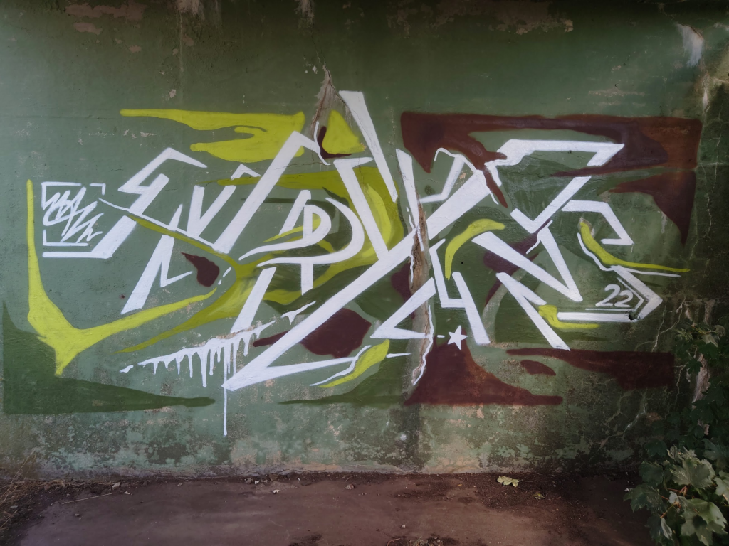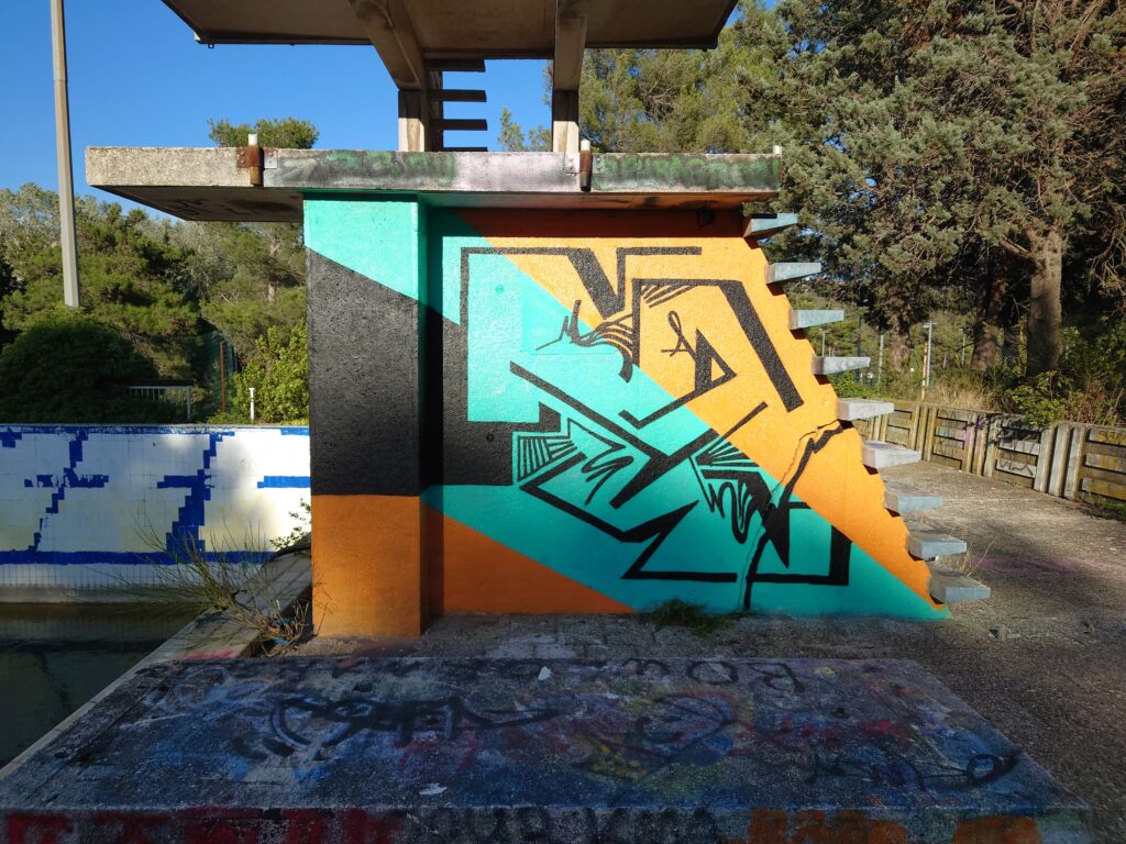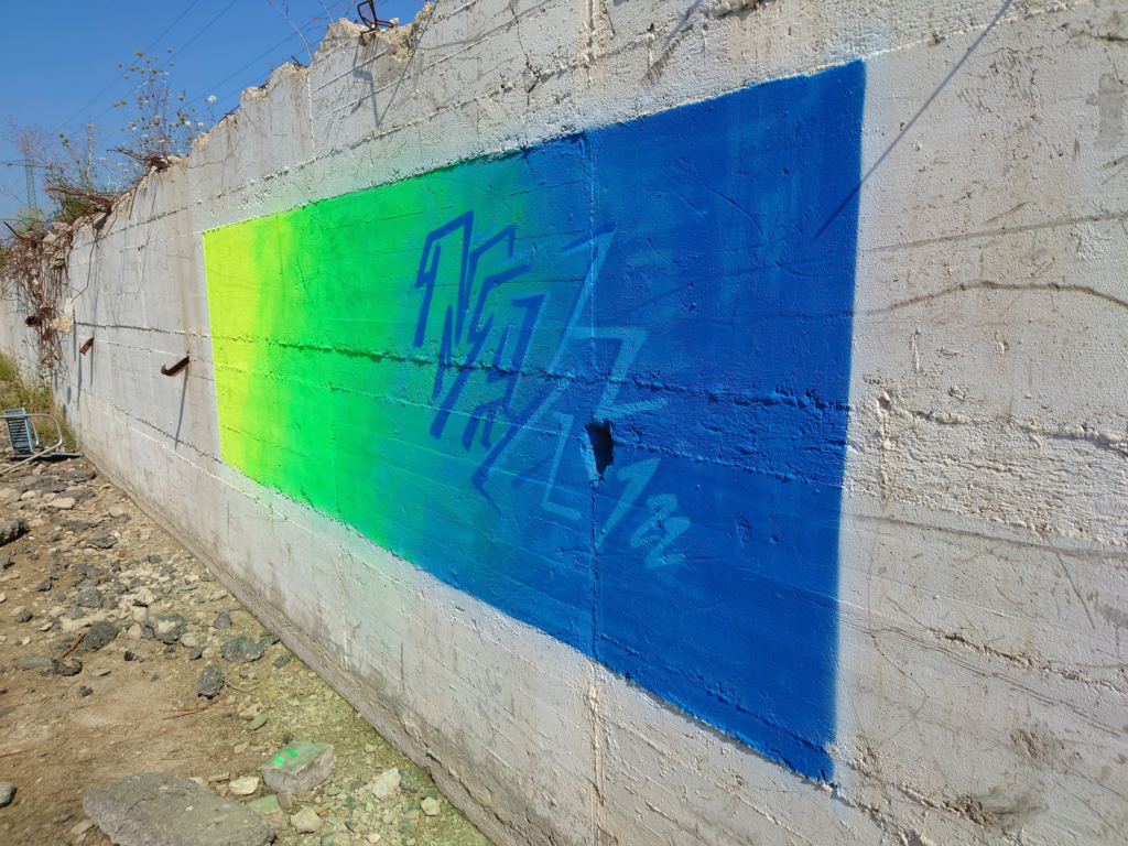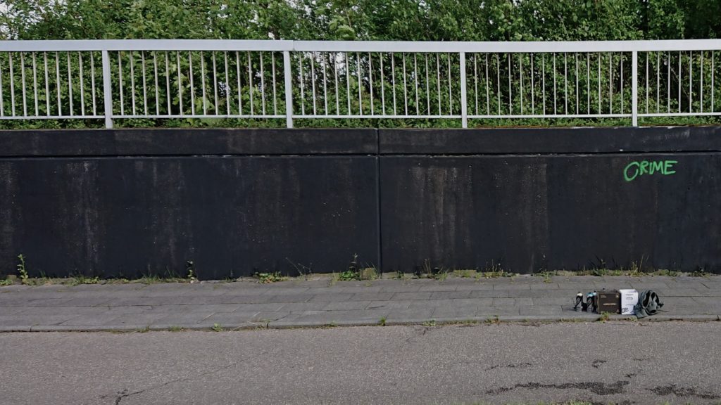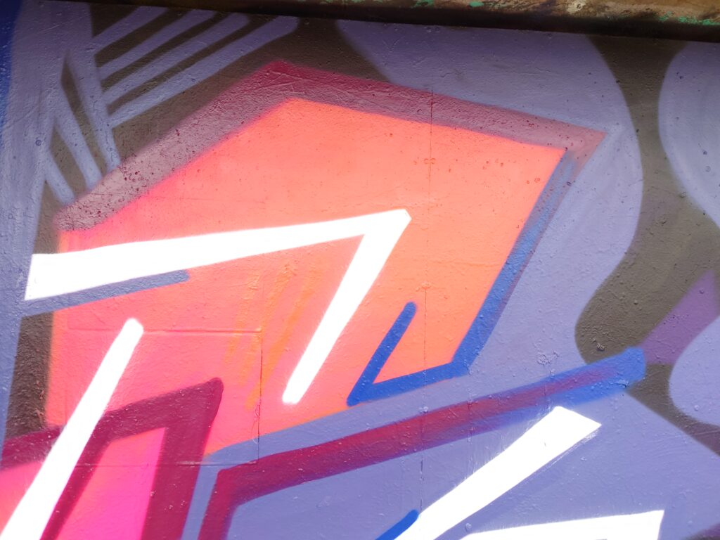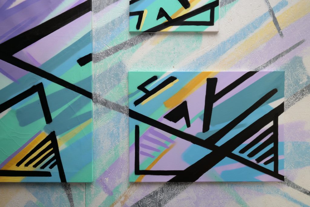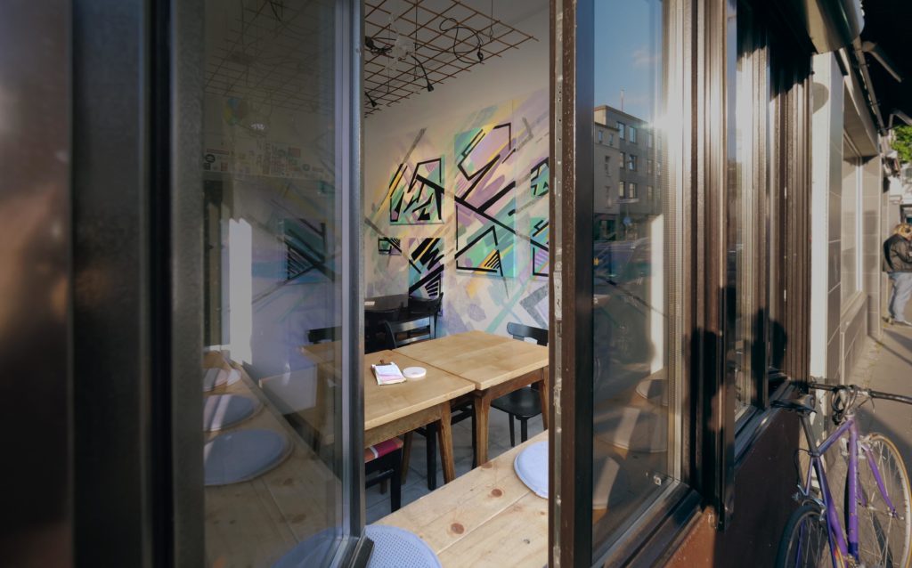 Viewed as an ensemble, Johannes Guerreiro’s work resembles a vibrant urban landscape. Spacious and immersive like an urban stage. Surfaces covered with spray paint at the intersection of gallery and street underpass. Johannes’ art moves between graffiti, media art and pop culture. His work for the Bar Trinkgenossin was created outdoors through dynamic layering of flat colors and rhythmic graphic patterns. Now it makes its way indoors into the public, pulsing casually like a conversation among friends. A temporary but lively collective of individual fragments.